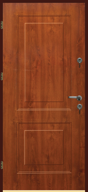 Skrzydło drzwiowe o grubości 45 mm wykonane jest z blachy ocynkowanej laminowanej w strukturze drewna lub lakierowane według palety RAL, wypełnione styropianem oraz wzmocnione specjalnymi kształtownikami.